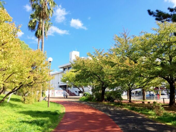 園内には博多体育館、博多市民センターもある。写真奥に見える白い建物が博多市民センター。3Fには博多図書館もある。