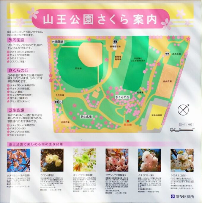 山王公園は春になると桜で染まる。桜の木の位置は上記の通り。ソメイヨシノが中心で桜の木の数は300本。さくらの丘、芝生広場には多くの人がシートを敷いて花見を楽しむ。