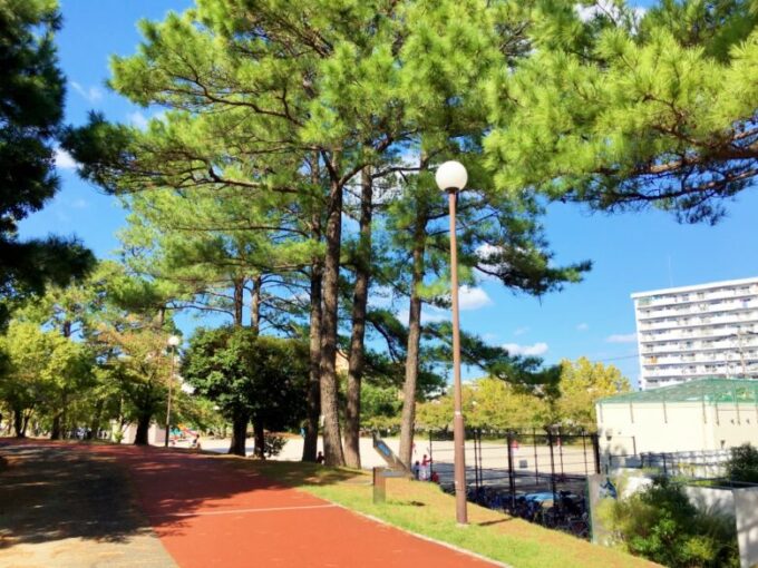 山王公園内の雰囲気。ご覧の通り、木々がたくさん立ち並び広い。手前のえんじ色の道はジョギングコース。ラバーシートが貼られているので足への負担が少ない。